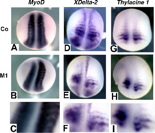 Fig. 8. Impaired somitogenesis in M1-injected embryos. (A) Whole-mount in situ hybridizations with MyoD (A), X-Delta-2 (D) or Thylacine 1 (G) to stage 20 (A) or stage 21 (D) embryos injected with 25 ng of Co or M1 into one cell at the two-cell stage. Injection of M1 inhibited somite segmentation for MyoD (panel B; 100%, n = 15) X-Delta-2 (panel E; 54%, n = 28) and Thylacine 1 (panel H; 53%, n = 15). Magnified images of somites in M1 embryos are shown in separate panels for MyoD (C), X-Delta-2 (F) and Thylacine 1 (I). Injection of Co had no effect (100% for MyoD, n = 29; 100%, n = 25 for X-Delta-2; 100%, n = 15 for Thylacine 1; panels A, D and G, respectively). All panels show dorsal view of embryos with anterior to the top and the injected side to the left.