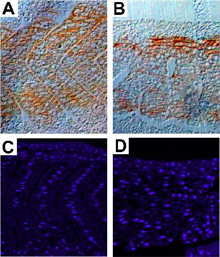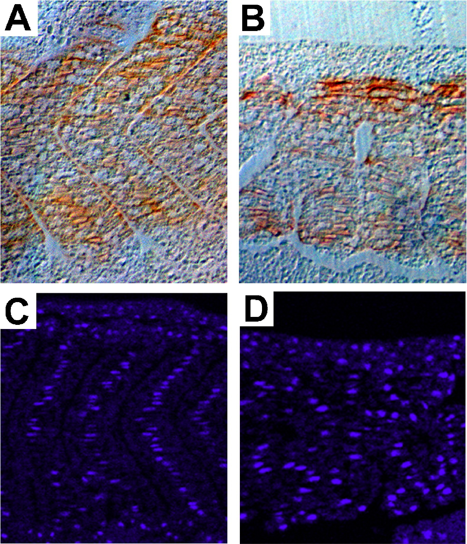 Fig. 9. Parasagittal sections of a stage 24 embryo injected in one cell at two-cell stage with 25 ng M1. Immunostaining with 12/101, a muscle-specific antibody to section of (A) uninjected and (B) M1-injected side shows disturbed somite morphology. DAPI staining of (C) uninjected and (D) injected side sections shows that cell orientation is also disrupted.