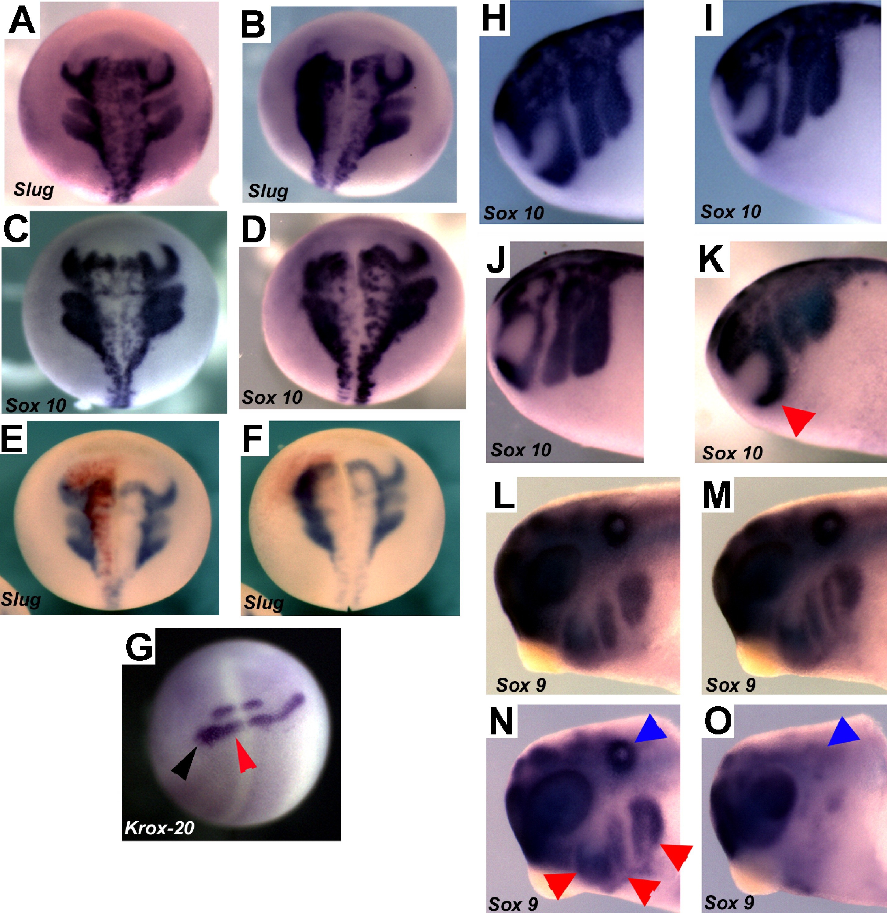 Fig. 5. PCNS loss of function. Whole-mount in situ hybridizations with NC markers to stage 19 (A), stage 22 (H) or stage 31 (L) embryos injected into one cell at the two-cell stage with 25 ng of M1 (B, D, G, K, O) or Co (A, C, I, M), or into one cell at the eight-cell stage with 6 ng of M1 (F) or Co (E), along with lacZ RNA as a lineage tracer. In situ probes are indicated on the individual panels at lower left. In each case, M1 resulted in severe inhibition of CNC cell migration into pharyngeal arches, and Co had no effect. In panels E and F, the lineage tracer is visible as red staining on the left side of the embryos. M1 injection inhibited migration of NC from rhombomere 5 (G; black arrowhead) without affecting the neural tube expression (red arrowhead). Panels A are dorsal views with the injected side on the left. In some cases, images were flipped horizontally to maintain this orientation. In panels H, the uninjected sides are shown on the left (H, J, L, N) and injected sides on the right (I, K, M, O). Images have been flipped horizontally to facilitate comparison of injected and uninjected sides. M1 strongly inhibited migration into posterior pharyngeal arches at stage 22 but had less effect on the mandibular arch migration (K; red arrowhead). Injection of Co had no effect (I). By stage 31 (L), Sox 9 expression in pharyngeal arches (N; red arrowheads) was essentially undetectable on the M1-injected side (O). Expression of Sox 9 in the otic vesicle was also strongly reduced (O; blue arrowhead). Injection of Co had no effect (M). Result statistics are summarized in Table 1.
