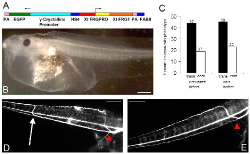 Fig. 4. Transgenic animals with FRE-specific expression of FRG1 have increased levels of vascular defects. (A) Diagram of the construct used to make transgenic tadpoles, depicting the gamma crystalline-EGFP reporter and the HS4 and Fab8 insulator sequences flanking the X. tropicalis (Xt) proximalfrg1 promoter, which drives expression of the X. tropicalis frg1 cDNA. (B,D,E) Transgenic animals displayed increased levels of ventral edema (B) or major vascular abnormalities (white arrow in D) when compared with non-transgenic controls (E) (red arrowheads indicate the normal vascular path). (C) Numbers of transgenic (trans) and non-transgenic embryos (cont) that display the ventral edema circulation defect or large vascular abnormalities. The numbers at the top of the bars indicate the total numbers of animals analyzed. Bars, 1 mm.