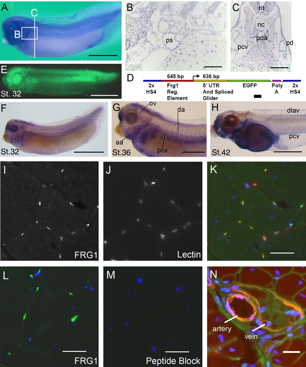 Fig. 1. Expression of the FRG1 protein during development. (A) Stage 36 whole-mount immunostaining shows the ubiquitous appearance of the FRG1 protein. FRG1-immunostained tadpoles were then sectioned either sagitally (B) or transversally (C) in the regions depicted in A. (D) Diagram of the minimal frg1 regulatory element (FRE) construct that was used to examine tissues with active transcription. EGFP expression was observed in stage 32 transgenic animals by both whole-mount fluorescence (E) and egfp in situ hybridization (F). By stage 36, transgenic egfp expression becomes restricted to muscle and vascular cell lineages (G), and by stage 42 it is observed almost exclusively within the vasculature (H). In adult X. laevis, immunostaining of FRG1 [green (I,K)] is observed in the gastrocnemius muscle, where it colocalizes precisely with rhodamine-labled lectin [red (J,K)], a marker for capillaries. Antibody specificity for the FRG1 peptide in these immunohistology experiments was confirmed by immunostaining with (M), or without (L), FRG1 peptide competition. (N) Strong FRG1 staining (red) was observed in arteries and veins in gastrocnemious sections co-stained with wheat germ agglutinin (green) and DAPI (blue). Abbreviations: ps, pronephric sinus; pd, pronephric duct; pcv, posterior cardinal vein; pda, paired dorsal arteries; nc, notochord; nt, neural tube; aa, aortic arches; ov, ophthalmic vessel; da, dorsal artery; dlav, dorsal lateralvein. Bars, 1 mm (A,EâH); 30 μm (B,C); 50 μm (KâN).