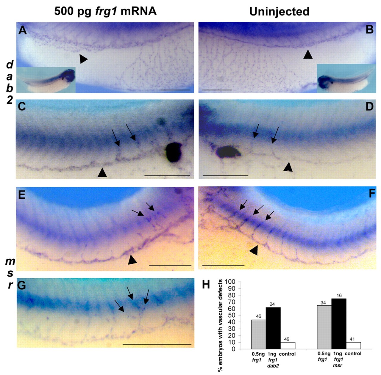 Fig. 3. Embryos with elevated FRG1 levels have increased angiogenesis and vascular dilation. (AâG) Stage 36 tadpoles injected with 500 pg of frg1 on one side of the embryo were analyzed for vascular abnormalities by using in situ hybridization to detect dab2 (AâD) or msr (EâG) transcripts. Abnormalities included branching of the posterior cardinal vein (black arrowhead in A), dilation of the posterior cardinal vein (black arrowheads in A,C,E), dilation of intersomitic veins (black arrows in C), and improper growth and branching of intersomitic veins (black arrows in E,G). For comparison, the uninjected sides of the embryos from A,C,E are shown in B,D,F, respectively. (H) Numbers of tadpole embryos displaying vascular abnormalities after injection with 500 pg of frg1, 1 ng of frg1 and tracer alone. The numbers above the bars indicate the total numbers of embryos analyzed. Bars, 0.5 mm.