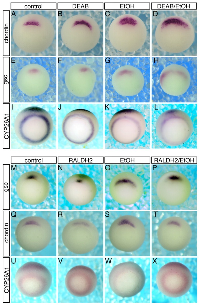 Fig. 5. Manipulation of RALDH modulates the effect of EtOH on gene expression domains during gastrulation. Sensitization to EtOH exposure by RALDH knockdown was shown by using DEAB to enhance the sensitivity to EtOH. Embryos were analyzed by in situ hybridization during early/mid gastrula stages (st. 10.5). Embryos were hybridized with the chordin (AâD,QâT), gsc (EâH,MâP) and Cyp26A1 (IâL,UâX) probes. (A,E,I) Control embryos. (B,F,J) DEAB-treated (20 μM) embryos. (C,G,K) Embryos exposed to EtOH (1.5%). (D,H,L) Combined treatment with DEAB and EtOH shows enhanced sensitivity to the EtOH exposure. Rescue of the EtOH effect was achieved by Raldh2 overexpression. (M,Q,U) Control embryos. (N,R,V) Embryos injected with Raldh2 mRNA. (O,S,W) EtOH-treated (1.5%) embryos. (P,T,X) Raldh2 overexpression rescues the EtOH-induced effects.