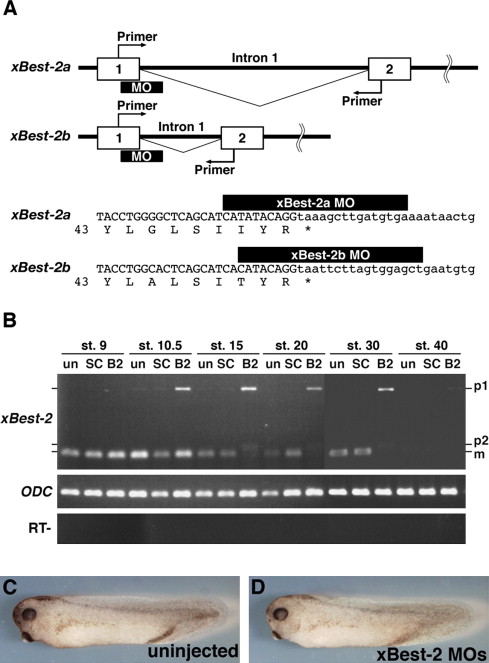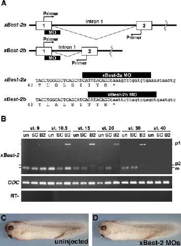 Loss-of-function study of xBest-2. (A) Genomic structures including exon 1 (1) and exon 2 (2) of xBest-2a and xBest-2b. The translation initiation codon (ATG) and primer regions are indicated (Primer). The splice-site-targeted antisense morpholino oligonucleotides, xBest-2a MO and xBest-2b MO, were designed against the sequence at the boundary of exon 1/intron 1 of each gene. xBest-2a and xBest-2b intron 1 have different lengths. The pre-mRNAs of xBest-2a and xBest-2b generated by splice blocking have a termination codon immediately following exon 1. The intron 1 sequences are in lower case. Amino acid sequences are also indicated. (B) RT-PCR analysis of xBest-2 mRNA in MO-injected embryos. Embryos were injected with 20 ng of xBest-2a MO plus 20 ng of xBest-2b MO (B2), or 40 ng of standard control MO (SC), in the marginal region of both blastomeres at the 2-cell stage, and cultured for RT-PCR until various stages as indicated above each lane. The primer set was designed to span the first intron to detect splicing of the endogenous pre-mRNA for both xBest-2a and xBest-2b (corresponding to Primer in (A)). In xBest-2 MO-injected embryos, the mature mRNA (m) was decreased and nonspliced pre-mRNA (p1 and p2) was detected from stage 10.5. The mature xBest-2 mRNA was eliminated at stage 30 in xBest-2 MO-injected embryos. Splicing of xBest-2 pre-mRNA was not affected by control MO injection. (C) A control uninjected embryo at stage 35 (uninjected). (D) An embryo injected with 20 ng of xBest-2a MO plus 20 ng of xBest-2b MO (xBest-2 MOs). Disruption of xBest-2 did not affect the patterning of embryos at stage 35. |