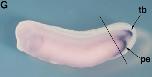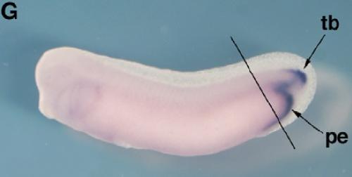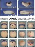 Conserved expression of Xenopus Best-2 gene in the organizer and blastopore lip. (A) Temporal expression of X. laevis Best-2 gene. RNA was extracted from X. laevis embryos at the stages indicated above each lane. egg, unfertilized egg; RT-, RT-PCR without reverse transcriptase. (BâJ) Spatial expression of X. laevis Best-2 analyzed by in situ hybridization. (B) Stage 10.5 embryo in vegetal view. Arrowhead indicates the blastopore. The line represents the position of the section shown in (I). (C) Stage 12 embryo in vegetal view. The line represents the position of the section shown in (J). (D) Stage 15 embryo in dorsal view. The line represents the position of the section shown in (K). (E) Stage 20 embryo in dorsal view. (F) Stage 25 embryo. (G) Stage 30 embryo. The line represents the position of the section shown in (L). (H) Stage 35 embryo. (I) Sagittal section of a stage 10.5 embryo. The arrowhead indicates the blastopore. (J) Sagittal section of a stage 12 embryo. Arrowheads indicate the edge of the yolk plug. (K) Transverse section of a stage 15 embryo. (L) Transverse section of a stage 30 embryo. nc, neural crest; ae, anterior endoderm; pe, posterior endoderm; tb, tailbud; ar, archenteron roof; ca, cloaca. (M) xBest-2 is induced by nodal signaling. Animal caps were dissected from embryos injected with 20 pg of Xnr5 RNA or 500 pg of VegT RNA, and cultured until stage 20 for RT-PCR. Both Xnr5 and VegT induced expression of xBest-2. un, uninjected animal caps as a negative control; WE, whole embryo as a positive control; RT-, reverse transcriptase minus as a negative control. |