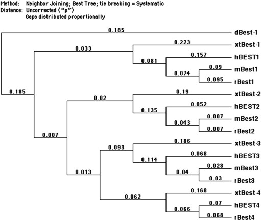 Phylogenetic tree of Bestrophin proteins. Multiple protein sequence alignments were performed using MacVector software (MacVector Inc). The following sequences were used: hBEST1 (NM_004183), hBEST2 (NM_017682), hBEST3 (NM_032735), hBEST4 (NM_153274), mBest1 (NM_011913), mBest2 (NM_145388), mBest3 (NM_001007583), rBest1 (NM_001011940), rBest2 (NM_001108895), rBest3 (XM_235161), rBest4 (XM_001067201), xtBest-1 (AB495092), xtBest-2 (NM_203643), xtBest-3 (AB495093), xtBest-4 (NM_001123442), and dBest-1 (AAR99659). hBEST, human BEST. mBest, mouse Best. rBest, rat Best. dBest-1, Drosophila Bestrophin-1. |