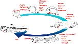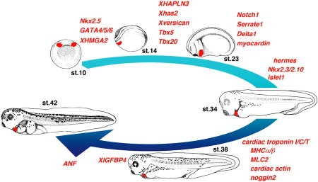 Figure 4. Already-known genes that were identified using the microarray. Gene names are indicated in red and arranged by embryonic stage. Nkx2.5 and GATA4/5/6 are among the earliest heart-related transcription factors (Tonissen et al.,1994, Afouda et al.,2005). Moreover, Nkx2.5 expression is regulated by both XHMGA2 and Smads (Monzen et al.,2008). The RNA-binding protein hermes also regulates Nkx2.5 expression (Gerber et al.,2002). Tbx5, Tbx20, myocardin, and islet1 are transcription factors that interact with Nkx2.5 and GATAs and regulate gene expression in the precardiac region (Stennard et al.,2003, Small et al.,2005, Brade et al.,2007). Both the Notch signal (Notch1, Serrate1, and Delta1) and hyaluronan matrix (Xhas2, Xversican, and XHAPLN3) genes are essential for the correct specification of myocardial cell fates (Rones et al.,2000, Ito et al.,2008). Finally, terminal differentiation marker genes (cardiac troponin I/C/T, MHCa/b, MLC2, cardiac actin, and ANF), which encode principally structural proteins, are expressed (Gurdon et al.,1989, Drysdale et al.,1994, Small and Krieg,2003). Moreover, cardiogenesis is maintained by several secreted factors (Eroshkin et al.,2006, Zhu et al.,2008).Download figure to PowerPoint |