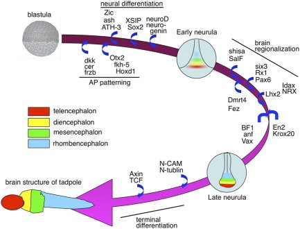 Figure 8. List of genes implicated in brain development. Representative genes involved in brain formation are indicated for each developmental stage. During the gastrula stage, neural tissue is induced and the anteriorâposterior (AP) axis is determined, resulting in fundamental neural tissue patterning. At the neurula stage, the anterior neural plate is subdivided into the telencephalon (red), diencephalon (yellow), mesencephalon (green), and rhombencephalon by the restricted expression of several brain-specific genes. At the tadpole stage, the brain region assumes a three-dimensional structure.Download figure to PowerPoint |