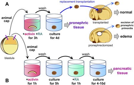 Figure 6. In vitro induction of pronephros or pancreas from animal caps treated with activin and retinoic acid (RA). Animal caps were excised and treated with activin and/or RA in Steinberg's solution (SS) supplemented with 0.1% bovine serum albumin (BSA). Explants were washed with SS and cultured in SS with 0.1% BSA. All the treatments and culturing were performed at 20°C. A: When animal caps were excised and treated with 10 ng/ml activin and 104 M RA simultaneously for 3 hr, washed and cultured for 4 days. The explants mainly differentiated into pronephric tissues. After this explant was transplanted to a pronephrectomized Xenopus embryo of stage 20â25, the transplanted embryo developed normally. In contrast, the pronephrectomized Xenopus embryo showed edema at the tadpole stages. B: When animal caps were treated with 100 ng/ml activin for 1 hr, washed and cultured for 3â5 hr in SS with 0.1% BSA, and then treated with 104 M RA for 1 hr, the explants differentiated into pancreatic tissues at a high frequency.Download figure to PowerPoint |