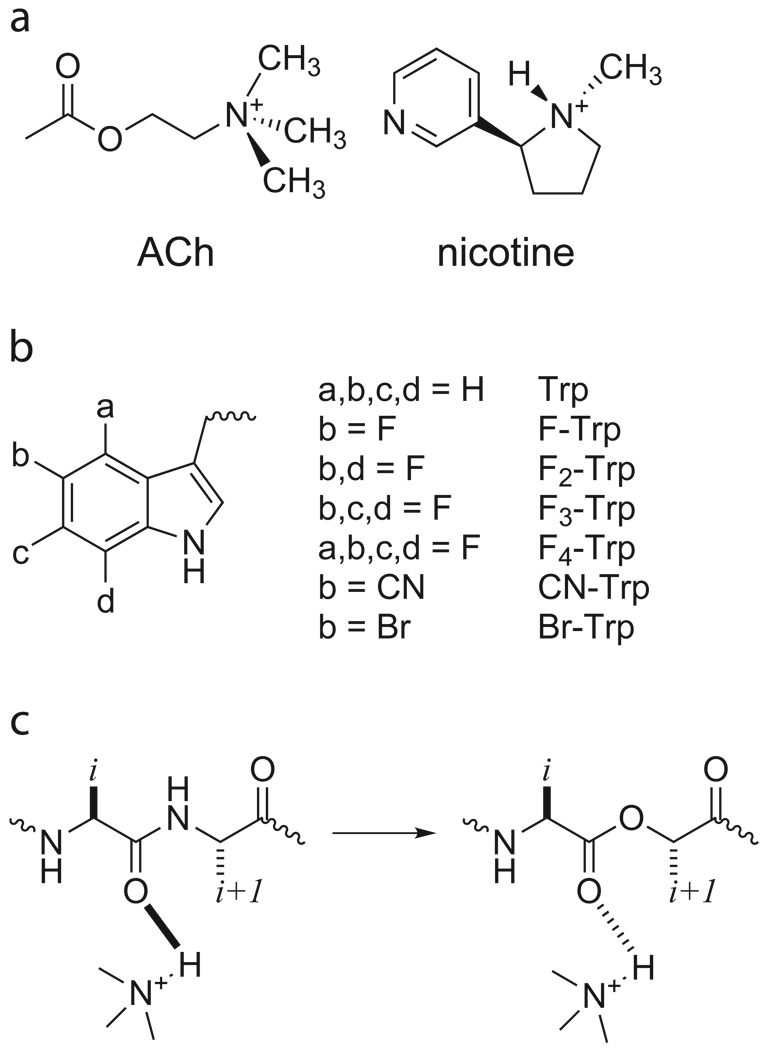 Figure 2. Agonists and unnatural amino acids considered here. a. Structures of ACh and nicotine. b. Unnatural amino acids considered here. If not indicated, an a, b, c, or d group is H. c. The backbone ester strategy for modulating a hydrogen bond.
