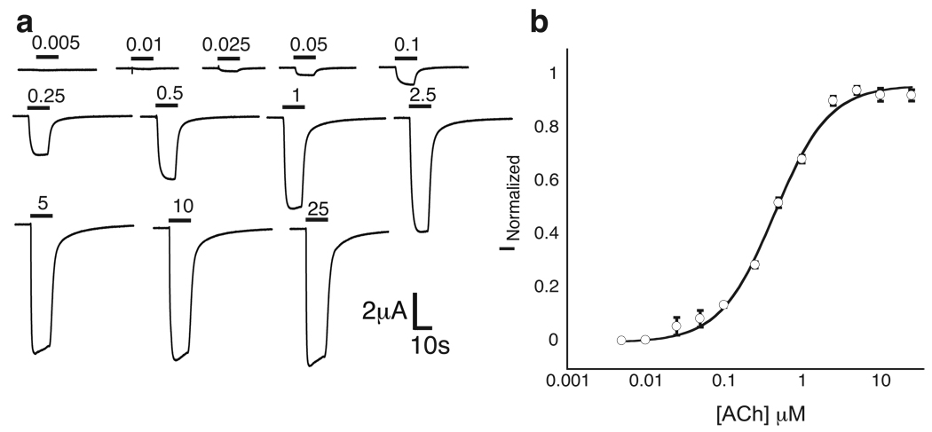 Figure 3. Nonsense suppression in the α4β2 receptor. Shown is a wild type recovery experiment, in which Trp is incorporated at the TrpB position. a. Representative traces of voltage-clamp currents. Bars represent application of ACh at concentrations noted. b. Fit of data in A to the Hill equation.
