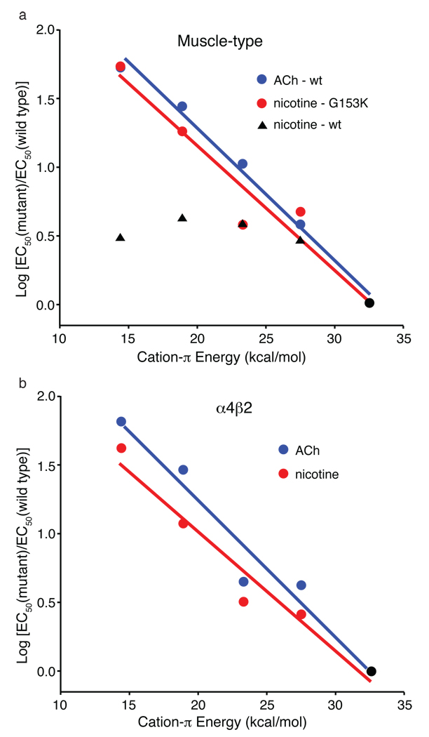 Figure 4. Fluorination plots. Note that in both plots, all data sets share the point at x = 32.6 kcal/mol (cation-π energy for Trp); y = 0 (black circle). Moving to the left then corresponds to monofluoro-, difluoro-, trifluoro- and tetrafluoro-TrpB. Cation-π binding energies (x-axes) are from 9. a. Muscle-type receptor. The designation “wt indicates G at position 153. b. α4β2 receptor.