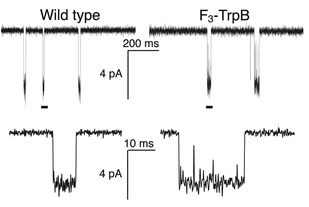 Figure 5. Single-channel recordings from wild type α4β2 (conventional expression) and the F3-Trp mutant (nonsense suppression) at site B, with nicotine applied at EC50 values (0.080 and 1.2 µM, respectively). Lower traces are expansions of the regions marked by a bar in the upper trace. Records were obtained in the cell-attached configuration with a pipette potential of +100 mV and are shown at 2 kHz bandwidth. Channel openings are shown as downward deflections.