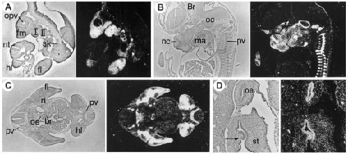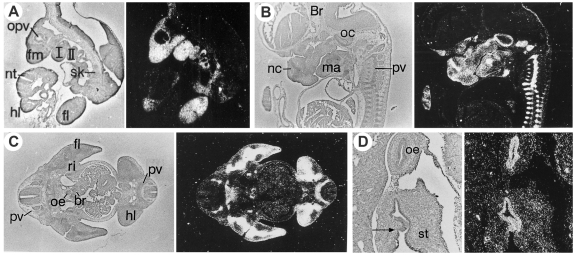 Figure 3. Expression features of murine Rarg.Parasagittal sections of E9.5 (A) and E12.5 (B) embryos; transverse section of an E12.5 embryo (C); detail of the oesophagus (oe) and stomach (st) of an E14.5 fetus (D), arrow pointing to the expression boundary at the limit of the squamous stomachal epithelium. 35S-labelled probes. Other abbreviations: I,II, branchial arches; Br, brain; br, stem bronchus; fl, forelimb bud; fm, frontonasal mesenchyme; hl, hindlimb bud; ma, mandible primordium; nc, nasal precartilage; nt, neural tube; oc, otic capsule; opv, optic vesicle; pv, prevertebra; ri, rib anlage; sk, sclerotome. From (Ruberte et al., 1990). |