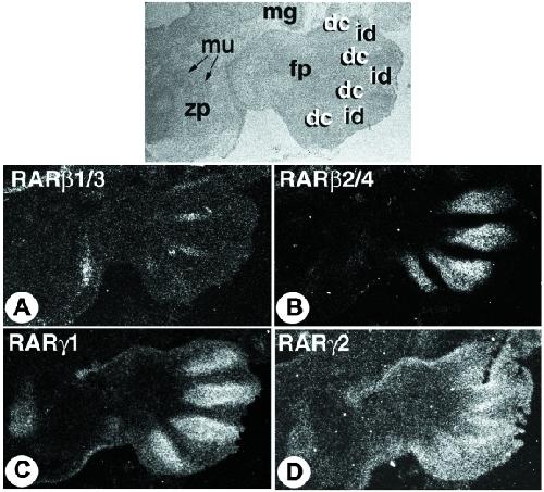 Figure 5. RAR expression in the differentiating limb.Comparative ISH of RARβ1/3, RARβ2/4, RARγ1 and RARγ2 on serial sections through the extremity (footplate) of an E13.5 hindlimb. 35S-labelled probes. Abbreviations: dc, digit precartilaginous condensation; fp, footplate; id, interdigital domain; mg, midgut; mu, muscle; zp, zeugopod (tibia/fibula region). From (Mollard et al., 2000). |