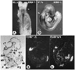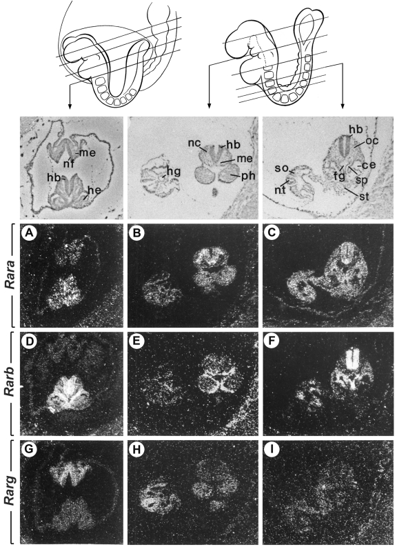 Figure 1. Expression of murine Rar genes in somite-stage embryos.Adjacent histological sections (planes of section as indicated by arrows on the schemes) from two embryos at the 8 somite (A,D,G) and 14 somite (B,C,E,F,H,I) stages were hybridized with 35S-labelled riboprobes for Rara (A-C), Rarb (D-F) and Rarg (G-I). Following emulsion autoradiography, sections are viewed under dark-field illumination showing the signal grains in white. Bright-field views are shown above for histology. Abbreviations: ce, celomic cavity; fg, foregut; hb, hindbrain; he, heart; hg, hindgut; me, mesoderm (primary mesenchyme); nc, neural crest; nf, neural folds; nt, neural tube; oc, occipital somite; ph, first pharyngeal (mandibular) arch; so, somite; sp, splanchnopleure; st, stomach primordium. From (Ruberte et al., 1991). |