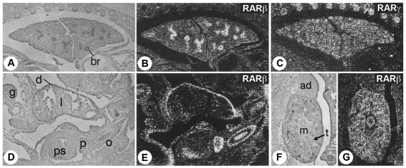 Figure 6. RAR expression in differentiating organs.(A-C) Comparative ISH of Rarb and Rarg on neighboring sections of the lung of an E14.5 mouse fetus. (D-G) Details of Rarb expression in abdominal organs at E12.5, and in the developing kidney at E14.5. 35S-labelled probes. Abbreviations: ad, adrenal gland; br, bronchus; d, diaphragm; g, gut; l, liver; m, metanephros; o, oesophagus; p, pancreas; ps, pyloric region of the stomach; t, metanephric tubules. From (Dolle et al., 1990). |