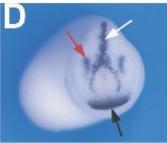 cxcl14 (Chemokine (C-X-C motif) ligand 14) gene expression in Xenopus laevis embryo via in situ hybridization, NF stage 23, anterior view, dorsal up. White arrow indicates expression in the hatching gland, red arrows the dorsal aspect of the optic vesicle and black arrow the cement gland. |