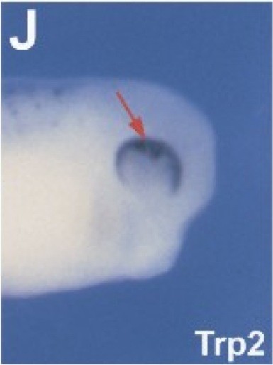 dct (dopachrome tautomerase) gene expression in Xenopus laevis embryo via in situ hybridization, NF stage 28, lateral view, anterior right. |