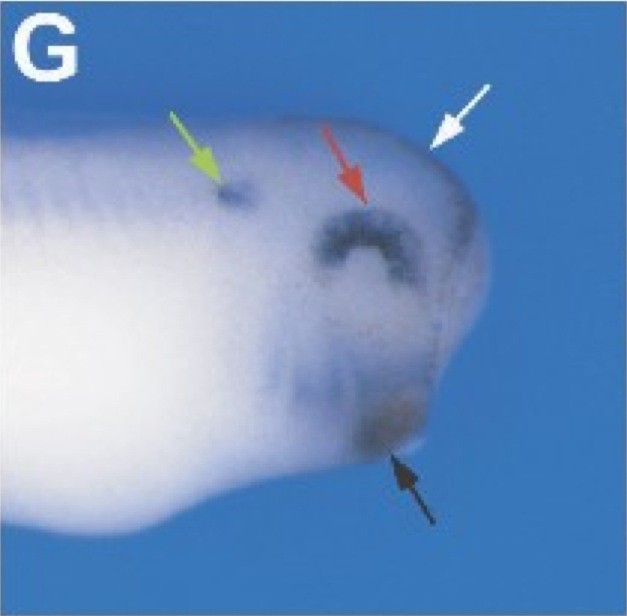cxcl14 (chemokine (C-X-C motif) ligand 14) is detected in part of the cement gland (black arrows), the dorsal anterior portion of the optic vesicle and the hatching gland (white arrows), in Xenopus embryo, at NF stage 23. |