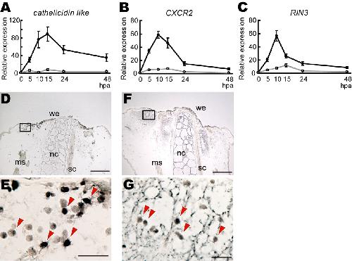 Fig. 1. Expression analysis of genes identified by differential display during the refractory and post-refractory periods. (A-C) cathelicidin-like (A), CXCR2 (B) and RIN3 (C)expression analysis. The relative amounts of transcripts determined by qRT-PCR were obtained by taking the value at 0 hpa as 1 for each refractory period(open circle) and post-refractory regeneration period (solid circle) after normalization relative to elongation factor 1α(EF1α) transcipt levels. (D-G) In situ hybridization for cathelicidin-like (D,E) and CXCR2 (F,G) using the sagittal sections of wound stumps during the post-refractory regeneration period 10 hpa. (E,G) Magnified views of the boxed area in D and F, respectively. Leukocyte-like cells expressing the genes are indicated with arrowheads. ms,muscle; nc, notochord; sc, spinal cord; we, wound epidermis. Scale bars: 300μm in D,F; 30 μm in E,G. |