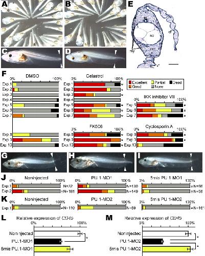 Fig. 3. Immunosuppressant treatment or injection of antisense MOs for PU.1 restores the regenerative ability during the refractory period. (A-D) Vehicle control (A,C) and Celastrol-treated tadpoles(B,D) during the refractory period, observed 7 dpa. Arrowheads indicate the amputation plane. (E) Coronal section of a regenerated tail of a Celastrol-treated tadpole. df, dorsal fin; me, mesenchyme; my, myotome; nc,notochord; sc, spinal cord; vf, ventral fin. Scale bar: 50 μm. (F)Frequency of regenerative ability (see key) of control and immunosuppressant-treated tadpoles (n=24 in each experiment). The numbers of tadpoles classified in each experiment are presented in Table S1 in the supplementary material. *P<0.003 usingχ 2 test (the number of dead tadpoles was excluded). (G)A noninjected tadpole with no apparent regeneration. (H) A PU.1-MO1-injected tadpole with a completely regenerated tail. (I) A 5mis PU.1-MO1-injected tadpole with no apparent regeneration.(J,K) Frequency of regenerative ability of noninjected,PU.1-MO1-injected and 5mis PU.1-MO1-injected (J), and PU.1-MO2-injected and 5mis PU.1-MO2-injected (K) tadpoles. The number of tadpoles classified in each experiment is presented in Table S2 in the supplementary material. *P<0.05, †P<1×10-12 usingχ 2 tests against experimental (PU.1-MO1- or PU.1-MO2-injected)tadpoles. (L,M) The relative amounts of CD45transcripts determined by qRT-PCR were obtained by taking the value of the noninjected group as 100%. Transcript levels were first normalized relative to EF-1α transcript levels. *P<0.01,Student's t-test. |