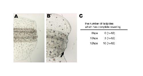 Fig. S1. The wound epidermis completely covers the amputated tail plane in most of the tadpoles within 8 to 12 hours post amputation. (A) Amputated tadpole tail at 0 hours post amputation (hpa) during the post-refractory regeneration period. The amputation plane was rough, as no wound epidermis formed. (B) Amputated tail at 12 hpa. The amputation plane was covered by wound epidermis (arrow). (C) Follow-up observation of covering of wound stump by the wound epidermis. Wound stumps were observed every 2 hours after amputation and the number of tadpoles with complete wound epidermis coverage was counted.