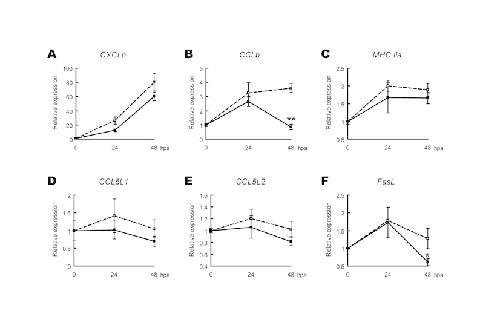 Fig. S3. FK506 antagonizes elevation of immune-related gene expression in amputated Xenopus tadpole tails during the refractory period. (A-E) We examined the effect of FK506 on the expression of five genes that were upregulated during the refractory period: CXCLh, CCLb, CCL5L1, CCL5L2 and MHC class II genes (Fig. 2D-H). In all cases, FK506 treatment decreased the expression of these genes: in particular, CCLb expression was significantly repressed at 48 hpa. (F) Furthermore, we cloned a X. laevis homolog of FASL (GenBank: AB435242), a major effector molecule that is utilized by natural killer cells and activated T cells to destroy target cells in mammals, and found that its expression was also significantly downregulated in FK506-treated groups. The relative amounts of transcripts obtained by qRT-PCR were determined by taking the value at 0 hpa as 1, after normalization using the EF-1α transcripts. Open square and dashed line, dimethyl sulfoxide-treated control groups; solid square and black line, FK506-treated groups. *P<0.05, **P<0.001 (Student�s t-test). |