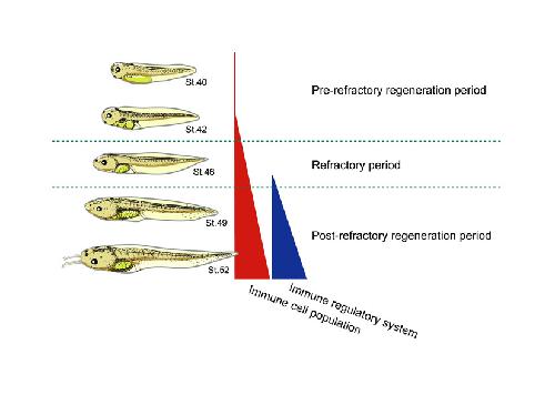 Fig. S5. Thematic model of the developmental stage-dependent regenerative ability in Xenopus tadpole tails. |