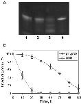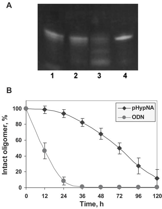 Figure 2. Analysis of the stability of the fluorescein-labeled pHypNA oligomer (Flu-1) by the electrophoresis in a 15% polyacrylamide gel in denaturing conditions. The oligomer (5 µM) was incubated at 37°C in 500 µl of DMEM/10% FBS. Aliquots (20 µl) were taken at each 24 h and frozen at −20°C until analysis by electrophoresis. (A) The image shows probes of the mimic oligomer taken after 48 h (1), 72 h (2), 120 h (3) and 0 h (4) incubation; the visualization was in UV-light at 365 nm. (B) The comparison of the stability of the fluorescein-labeled pHypNA oligomer and the control 3′-fluorescein-labeled oligodeoxyribonucleotide of the same sequence. Densitometric calculations of the amount of full-length oligomer were done using UVP Bio-Imaging system and LabWorks imaging software.