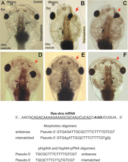 Figure 6. Images of Xenopus tadpole heads as seen from the dorsal side and the sequences of MO, pHypNA and HypNA-pPNA oligomers used in Ras-dva mRNA translation inhibitory assays. The injection of antisense oligomers results in severe abnormalities of the head structure. The side of injection is shown by red arrow. (A) A control tadpolehead; (B, C and D) heads of tadpoles developed from the embryos microinjected with the antisense MO, pHypNA and HypNA-pPNA oligomers, respectively; (E and F) heads of tadpoles developed from the embryos microinjected with the mismatched pHypNA and HypNA-pPNA oligomers.