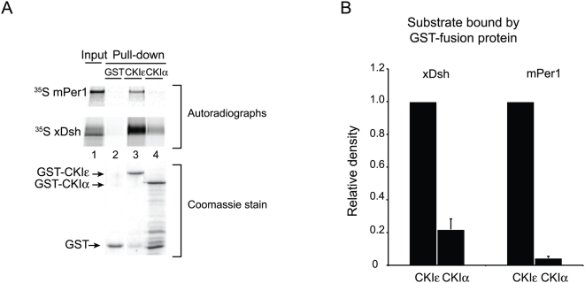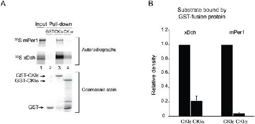 Figure 1. Recombinant CKIε, but not CKIα, interacts with mPer1 and xDsh.(A) GST, GST-CKIε, or GST-CKIα was bound to glutathione sepharose, and then incubated with 35S-labeled mPer1 or xDsh. 10% of the mPer1 input and 25% of the xDsh input are shown. Coomassie stained gel shows the levels of GST fusion protein used for each pull-down. (B) Quantification of three independent experiments. Values are normalized against the amount of protein bound by GST-CKIε, and error bars represent standard deviation of the mean. |
