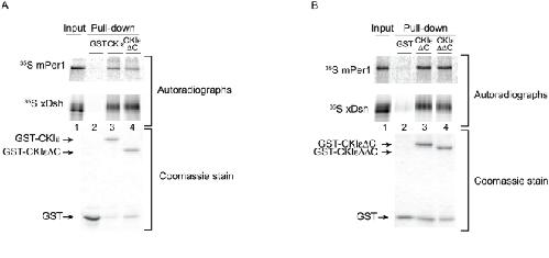 Figure 3. xDsh and mPer1 do not require CKIε's C-terminus for binding.(A, B) Purified GST, GST-CKIε, GST-CKIεΔC or GST-CKIεΔΔC were bound to glutathione sepharose and incubated with 35S-labeled xDsh or mPer1 as indicated. |