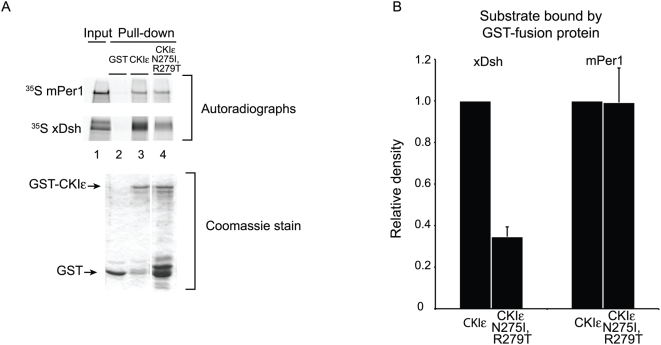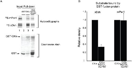 Figure 5. The C-terminal tail enhances binding of xDsh and mPer1 to mutant CKIε.(A) GST, GST-CKIε, or GST-CKIε N275I/R279T was bound to glutathione sepharose and incubated with 35S-labeled xDsh or mPer1. (B) Quantification of three independent experiments. Values are normalized against the amount of protein bound by GST-CKIε. |
