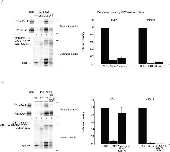 Figure 6. A. Neither xDsh nor mPer1 bind strongly to CKIα→ε.GST, GST-CKIε (partially purified) or GST- CKIα→ε, was bound to glutathione sepharose and incubated with 35S-labeled xDsh or mPer1. (B) GST, GST-CKIε, or GST- CKIα→ε I283N/T287R, was bound to glutathione sepharose and incubated with 35S-labeled xDsh or mPer1. The bar graphs represent quantification of three independent experiments. Values are normalized against the amount of protein bound to GST-CKIε. |