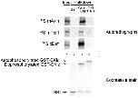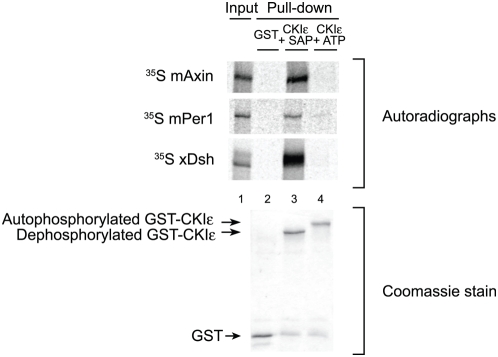 Figure 7. Autophosphorylation of CKIε inhibits binding by substrate and scaffolding proteins.Purified GST and GST-fusion proteins were bound to glutathione sepharose and bound GST-CKIε was incubated with SAP or ATP for 1 hour. Resin was incubated with 35S-Methionine-labeled xDsh, mAxin or mPer1. 10% of the mPer1and mAxin input and 25% of the xDsh input were run. Coomassie stained gel shows the levels of GST fusion protein used for each pull-down. |
