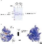Figure 8. Analysis of the binding of the C-terminal tail.(A) Full-length CKIε was incubated with either SAP or ATP prior to reaction with the EDC crosslinker. Lane 2 shows that there is no change in the apparent molecular weight of dephosphorylated CKIε. In lane 4, there is marked change in the migration of autophosphorylated, crosslinked CKIε (bracketed). Asterisk shows a high molecular weight species that may correspond to SAP-CKIε oligomers (lane 2). (B) Space-filling models of CKIδ are shown. The APBS plugin for PyMol (DeLano Scientific LLC) was used to establish electrostatic potential of solvent exposed atoms. Positively charged areas are shaded blue and correspond to basic regions of the protein; negatively charged regions are red, and correspond to acidic areas. The highly basic groove that has been postulated to be a phosphate recognition region is conservered across the CKI family. The two identified cross-linked residues are indicated with an X. The cartoon line on the left side diagram shows the position of the first 20 amino acids of the tail based on the crosslinking data. The dotted line on the right side shows the proposed extension of the tail onto the backside of the kinase. |