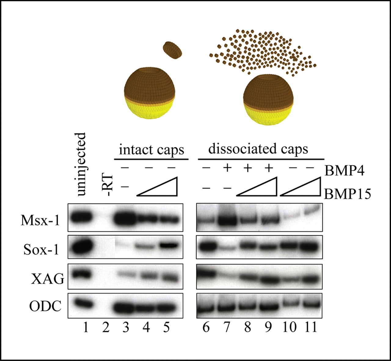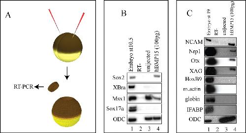 Genes referenced: acta4 actc1 actl6a ag1 babam2 bmp15 bmp4 ctnnb1 fabp2 hoxb9 msx1 myc ncam1 nodal3 nodal3.2 nrp1 odc1 sia1 smad1 sox2 tbxt tbxt.2 wnt8a