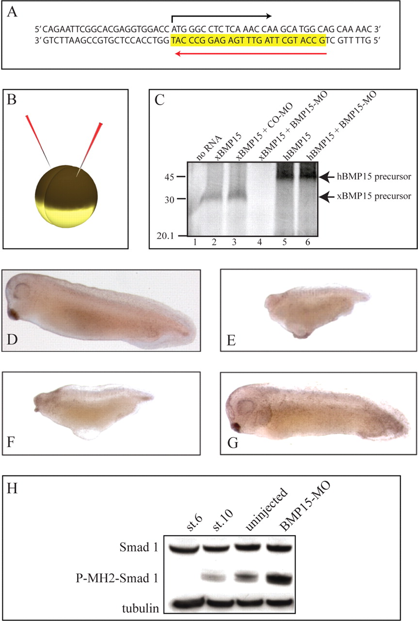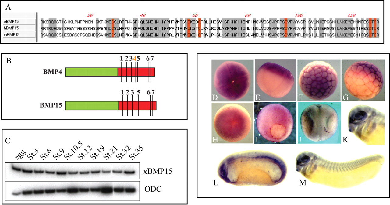 Bone morphogenetic protein 15 (BMP15) belongs to an unusual subgroup of the transforming growth factor beta (TGFbeta) superfamily of signaling ligands as it lacks a key cysteine residue in the mature region required for proper intermolecular dimerization. Naturally occurring BMP15 mutation leads to early ovarian failure in humans, and BMP15 has been shown to activate the Smad1/5/8 pathway in that context. Despite its important role in germ cell specification, the embryological function of BMP15 remains unknown. Surprisingly, we find that during early Xenopus embryogenesis BMP15 acts solely as an inhibitor of the Smad1/5/8 pathway and the Wnt pathway. BMP15 gain-of-function leads to embryos with secondary ectopic heads and to direct neural induction in intact explants. BMP15 inhibits BMP4-mediated epidermal induction in dissociated explants. BMP15 strongly inhibits BRE response induced by BMP4 and blocks phosphorylation and activation of Smad1/5/8 MH2-domain. Mechanistically, BMP15 protein specifically interacts with BMP4 protein, suggesting inhibition upstream of receptor binding. Loss-of-function experiments using morpholinos or a naturally occurring human BMP15 dominant-negative mutant (BMP15-Y235C) leads to embryos lacking head. BMP15-Y235C also eliminates the inhibitory activity of BMP15 on BRE (BMP-responsive element). Finally, we show that BMP15 inhibits the canonical branch of the Wnt pathway, upstream of beta-catenin. We, thus, demonstrate that BMP15 is necessary and sufficient for the specification of dorso-anterior structures and highlight novel mechanisms of BMP15 function that strongly suggest a reinterpretation of its function in ovaries specially for ovarian failure.