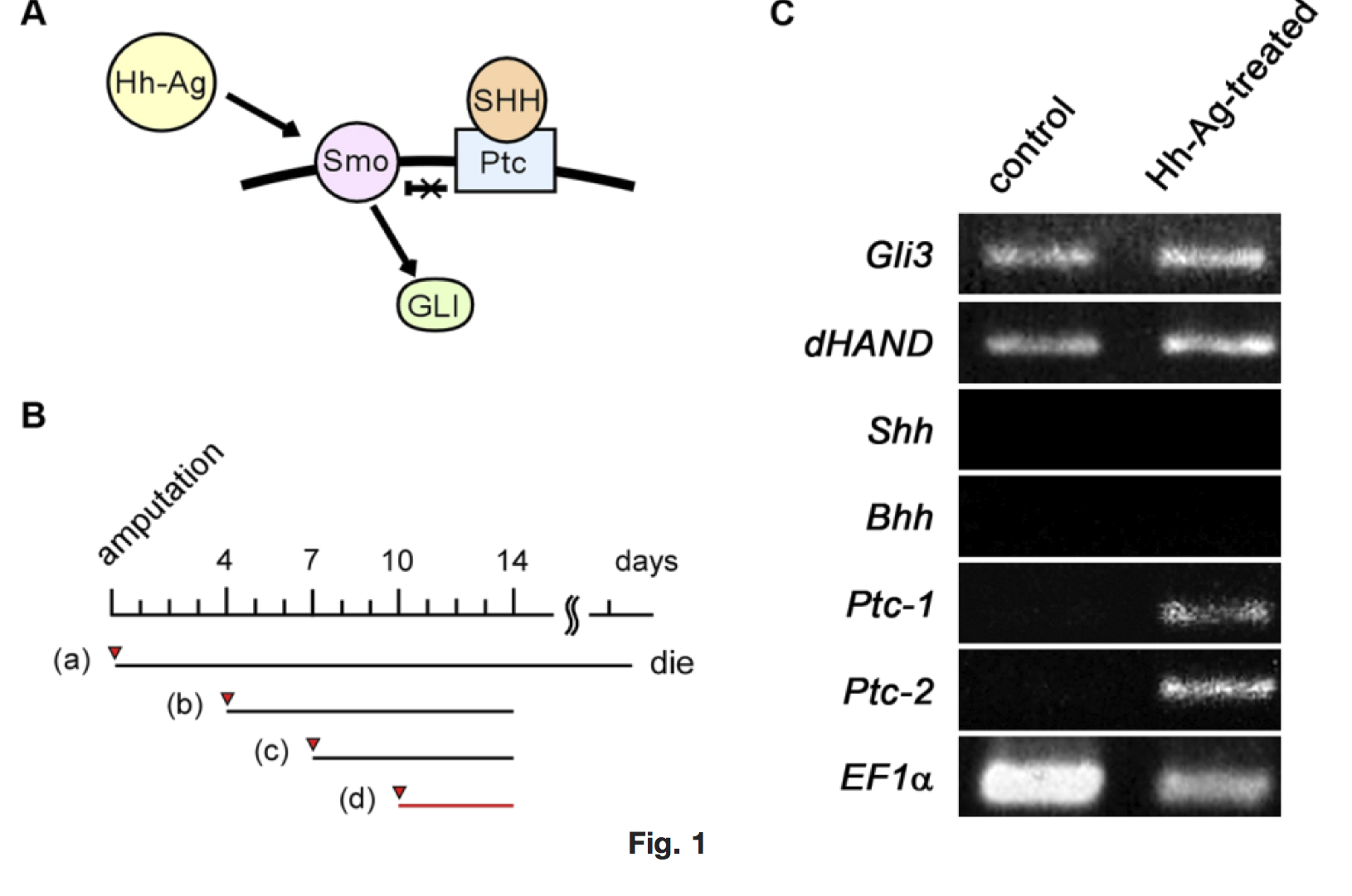 Fig. 1. Effects of Hedgehog signaling agonist (Hh-Ag) in the Xenopus froglet limb regeneration process. A: Hh-Ag binds directly to Smo and activates the Hh signaling pathway. This action is independent of Hh protein and of the receptor Ptc and is absolutely required for Smo. B: Various concentrations and periods of treat- ment were performed to determine the optimal conditions for Hh-Ag administration. Hh-Ag ad- ministration was started immediately after limb amputation (a) or at 4 (b), 7 (c), and 10 days after amputation (d). Arrowheads (red) show the on- set of administration and lines indicate the pe- riod of treatment. Hh-Ag treatment with full- term administration (a) of Hh-Ag was lethal. The Hh-Agâtreated froglets died from treatment for 10 (b) and 7 days (c) at a concentration of 250 nmol/L, but concentrations of 10, 25, and 75 nmol/L were nontoxic. Froglets treated with Hh-Ag for 4 days (d) did not die. C: Reverse transcriptase-polymerase chain reaction (RT- PCR) analysis of the froglet blastema at 14 days after limb amputation. In the froglet limb blast- ema, signals for Shh and Bhh mRNA were not detected, but Gli3 and dHAND expression was detected. Of interest, Ptc-1 and Ptc-2 were re- expressed in the Hh-Agâtreated blastema but were not detected in the control.