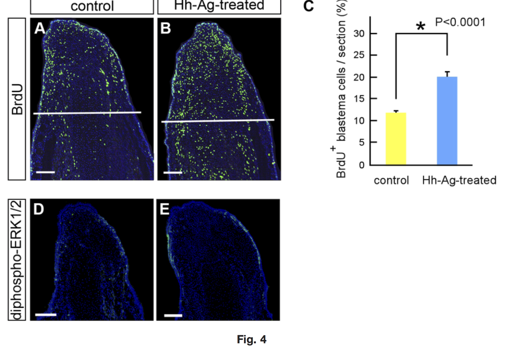 Fig. 4. Cell proliferation and activity of ERK1/2 in the froglet blastema. Immunostaining was performed with anti-bromodeoxyuridine (BrdU; A,B) and antiâdiphospho-ERK1/2 (D,E). A,B: At 14 days after amputation, cells incorporating BrdU were detected in the blastema. C: An approxi- mately 1.7-fold increase in cell proliferation was observed in the Hh-Agâtreated blastema (B) compared with that in the control blastema (A). Of interest, bromodeoxyuridine (BrdU) -positive cells also increased in the stump region of the Hh-Agâtreated froglet. Data were analyzed by the t-test. D,E: At 14 days, activity of MEK/ERK was hardly detectable in the mesenchyme of the control blastema (D) and Hh-Agâtreated blastema (E). Nuclei were stained with DAPI (4 ,6-diami- dine-2-phenylidole-dihydrochloride; A,B,D,E). The anterior side is on the left of all panels and lines indicate the amputation plane. Scale bars 200 m.