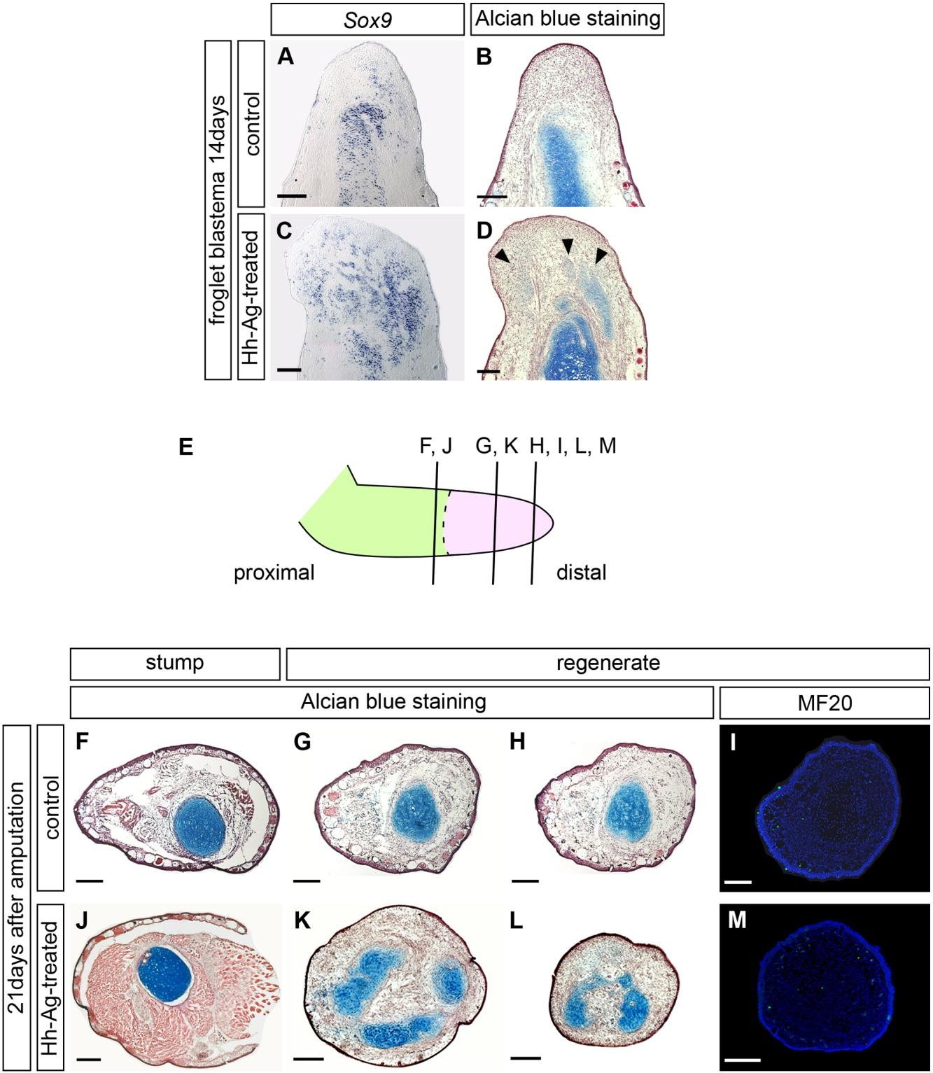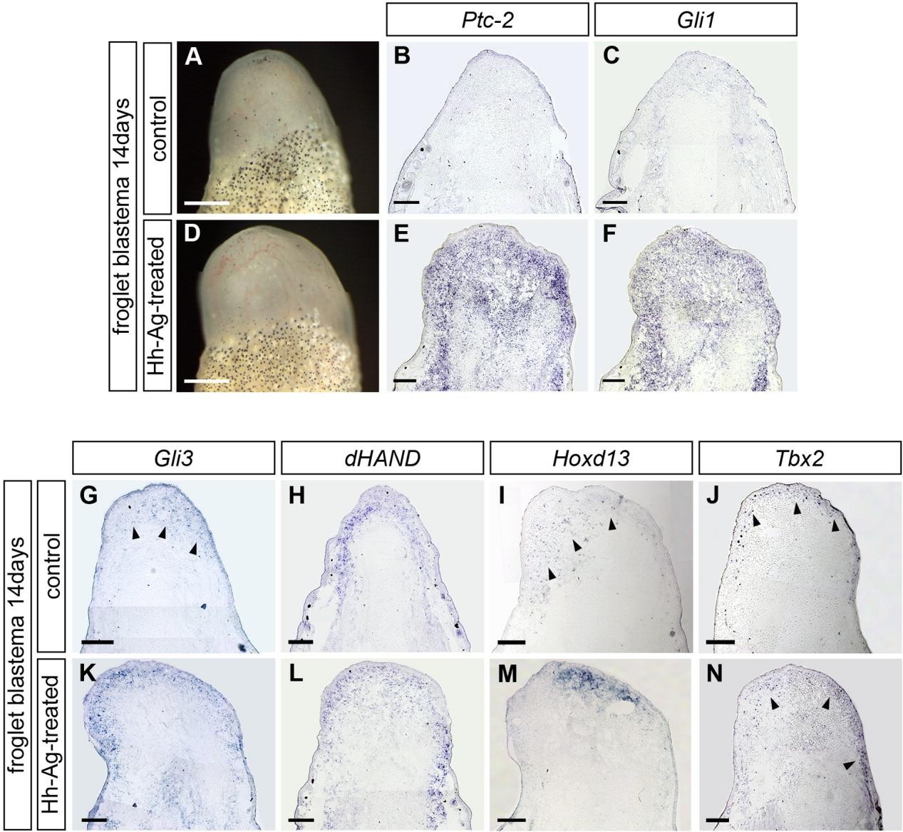 Figure 3. Changes in gene expression induced by Hh signaling activation in the froglet blastema at 14 days after amputation. A,D: The Hh-Ag-treated blastema (D) was larger than the control blastema (A). B,C,E,F: In the control blastema, signals for Shh target genes, Ptc-2 and Gli1, were not detected, whereas these genes were strongly re-expressed in the Hh-Ag-treated blastema. G-N: Signals for Gli3 (K) and dHAND (L) were detected in the Hh-Ag-treated blastema and their expression patterns were similar to those in the control blastema (Gli3, arrowheads in G; dHAND, H). Stronger expression of Hoxd13 was observed in the distal region of the Hh-Ag-treated blastema (M), but expression was weak in the control blastema (arrowheads in I). Tbx2 expression was slightly detected in both the control blastema (arrowheads in J) and Hh-Ag-treated blastema (arrowheads in N). All sections are transverse sections, and the anterior side is on the left of all panels. Scale bars = 200 mu m.