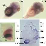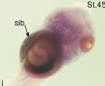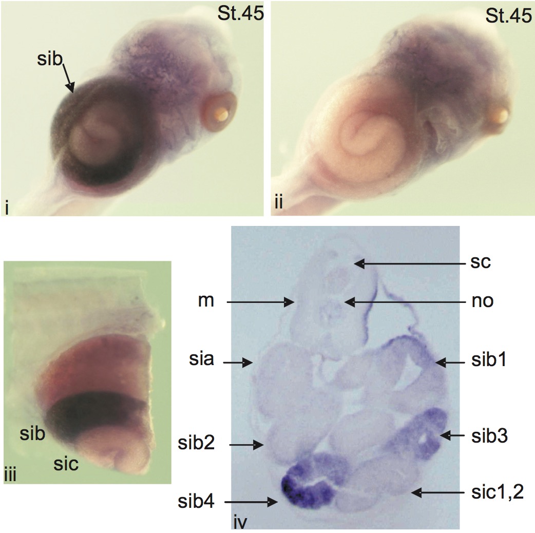 Figure 6 D. Spatial expression profile of enpp1, 4, 6 and 7 during development.Whole-mount in situ hybridisation analysis of enpp7 expression. Ventral view of stage 45 embryos hybridized with anti-sense (i) and sense (ii) probe, lateral view of the gut region of a stage 45 embryo (iii), cryostat section (iv) at 28μm of a stage 45 embryo through the gut. no, notochord; m, muscles; sc, spinal cord; sia, first sections of the small intestine; sib, external coil of small intestine; sic, internal coil of small intestine (from Chalmers and Slack, 1998). |