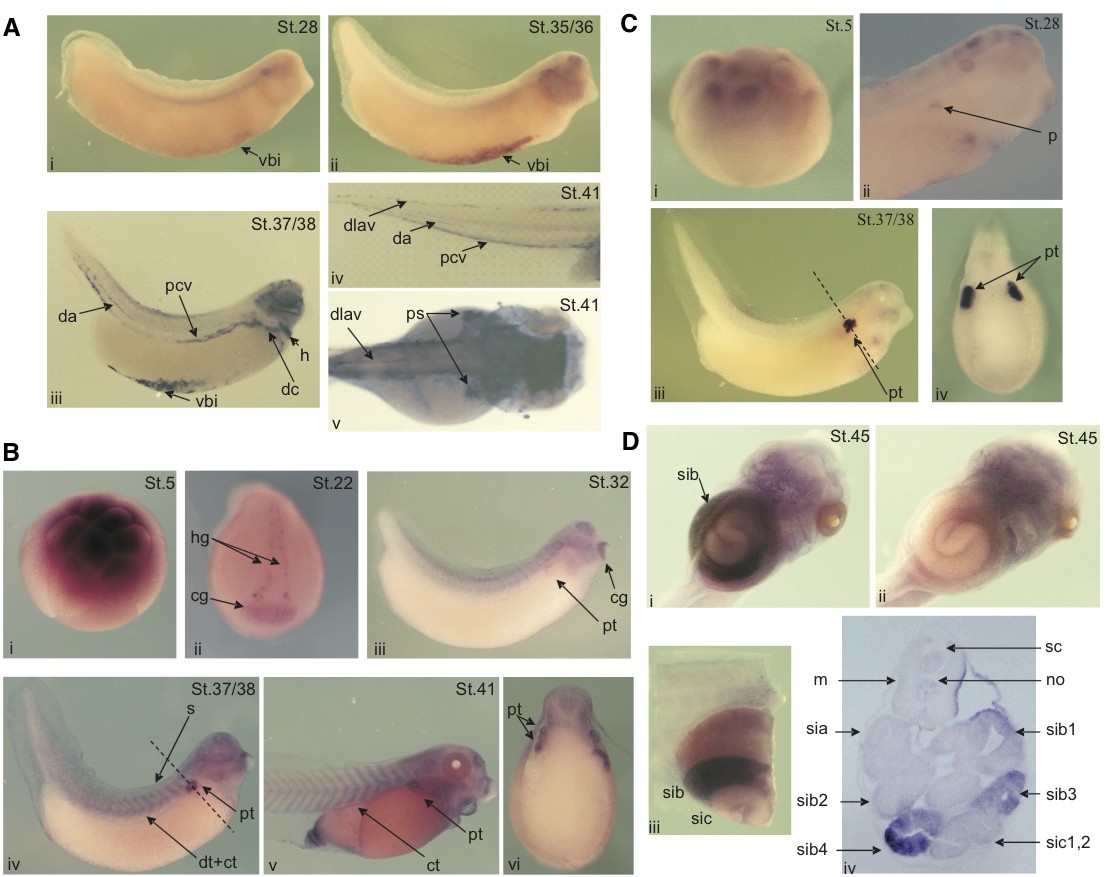 Fig. 6. Spatial expression profile of enpp1, 4, 6 and 7 during development. Whole mount in situ hybridisation with DIG-labelled antisense RNA probes was performed on embryos from stages 5-41 for enpp1, 4, 6 and stages 32-45 for enpp7. All embryos were analysed from the same experimental set. The differences in colours result from clearing the embryos and photographing them against a white background to visualise staining. (A) Whole-mount in situ hybridisation analysis of enpp1 expression. Lateral view at stages 28 (i), 35/36 (ii) and 37/38 (iii). Detail of the fin at stage 41 (iv) and dorsal view of a stage 41 embryo (v). Anterior is right and dorsal is up, except in (v). da, dorsal aorta; dc, duct of cuvier; dlav, dorsal longitudinal anastomosing vessel; h, heart; pcv, posterior cardinal vein; ps, pronephric sinus; vbi, ventral blood island. (B) Whole-mount in situ hybridisation analysis of enpp4 expression. Animal view at stage 5 (i), anterior view at stage 22 (ii), lateral view at stages 32 (iii), 37/38 (iv) and 41 (v). For the lateral views, dorsal is up and anterior is right. Transverse sections at stage 37/38 through the proximal tubules (vi). Dorsal is up. The dotted line through the pronephric tubules (iii) correspond to planes of section in (vi). cg: cement gland; ct, collecting tubules; dt, distal tubules; hg, hatching gland; pt, proximal tubules; s, somites. (C) Whole-mount in situ hybridisation analysis of enpp6 expression. Lateral view at stage 5 (i), lateral view at stage 28 (ii) and 37/ 38 (iii). Dorsal is up and anterior is right. Transverse sections in the proximal tubules level at 37/38 (iv). The dotted line through the pronephric tubules correspond to planes of section in (iv). p, pronephros; pt, proximal tubules. (D) Whole-mount in situ hybridisation analysis of enpp7 expression. Ventral view of stage 45 embryos hybridized with anti-sense (i) and sense (ii) probe, lateral view of the gut region of a stage 45 embryo (iii), cryostat section (iv) at 28μm of a stage 45 embryo through the gut. no, notochord; m, muscles; sc, spinal cord; sia, first sections of the small intestine; sib, external coil of small intestine; sic, internal coil of small intestine (from Chalmers and Slack, 1998). |