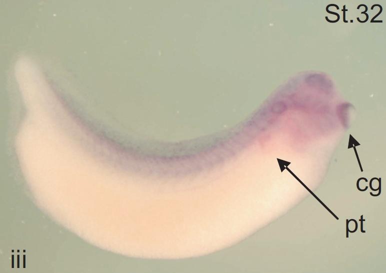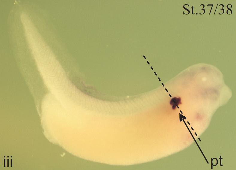 enpp2 (ectonucleotide pyrophosphatase/phosphodiesterase 2) gene expression in Xenopus laevis embryos, NF stage 26, as assayed by in situ hybridization, lateral view, anterior left, dorsal up. |