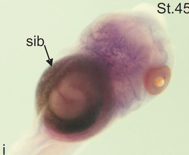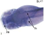 Nasal or olfactory placode (ns) and lymph hearts (left and right) (lh) are visible in this dorsal view of a NF stage 41 X. laevis tadpole, visualised via in situ hybridization for expression of enpp2a (ectonucleotide pyrophosphatase/phosphodiesterase 2). |