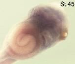 enpp7 ( ectonucleotide pyrophosphatase/phosphodiesterase 7 ) gene expression in Xenopus laevis embryos, NF stage 45, as assayed by in situ hybridization, ventral view. |