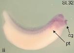 enpp4 (ectonucleotide pyrophosphatase/phosphodiesterase 4) gene expression in Xenopus laevis embryos, NF stage 32, as assayed by in situ hybridization, lateral view, anterior right, dorsal up. |