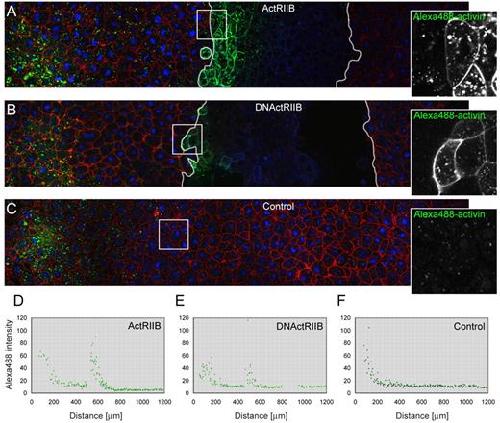 Fig. 4. Overexpression of ActRIIB blocks activin passage and enhances its cellular uptake. (A-C) Three animal pole regions were juxtaposed such that the left-hand tissue acted as a source of Alexa488-activin (provided by a bead soaked in fluorescent activin, located outside of the depicted confocal section), the middle piece was the test tissue, and the right-hand tissue functioned as recipient tissue. White lines in A and B represent boundaries between the different regions. Alexa488 signal is green, mCherry membrane marker is red (control tissue), and CFP-histoneH2B (control) and CFP-GPI membrane marker (test tissue) are blue. This experiment was carried out four times, with similar results each time. (A) Overexpression of wild-type ActRIIB in the middle explant leads to the accumulation of Alexa488-activin close to the junction between the two populations of cells,both at the cell surface and within cells (see also Fig. S3 in the supplementary material). (B) Overexpression of a truncated form of ActRIIB(DNActRIIB) in the middle explant leads to the accumulation of Alexa488-activin close to the junction between these cells and the left-hand explant. Fluorescence is visible both at the cell surface and within cells(see also Fig. S3 in the supplementary material). (C) Control for A and B in which all three animal pole tissues express mCherry membrane marker and CFP-histoneH2B only. Images on right represent enlargements of outlined areas.(D-F) Quantitation of intracellular Alexa488-activin fluorescence for pictures shown in A-C (for methods see Fig. 2). |