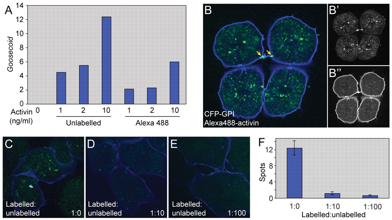 Fig. 1 Alexa488-activin internalisation in dissociated animal cap cells.(A) Real-time RT-PCR analysis of dissected animal pole tissue treated with the indicated amounts of unlabelled activin or Alexa488-activin and cultured to the equivalent of the early gastrula stage. Bars indicate induction of Gsc. Note that unlabelled activin is approximately twice as effective as Alexa488-activin in inducing Gsc. This experiment was carried out four times, with similar results each time. (B-Bâ³)Dissociated animal pole cells at the late blastula stage following incubation in Alexa488-activin for 1 hour before washing. Cells were derived from embryos that had previously been injected with the membrane marker CFP-GPI (blue).(Bâ²) Alexa448 fluorescence alone. (Bâ³) CFP-GPI fluorescence alone. Note Alexa488-activin accumulation at a cell-cell bridge (arrow in B).(C-F) Competition experiment in which cells are treated with Alexa488-activin in the presence of increasing amounts of unlabelled activin.(C) Internalisation of Alexa488-activin in the absence of unlabelled activin.(D) Internalisation of Alexa488-activin in the presence of a 10-fold excess of unlabelled activin. (E) Internalisation of Alexa488-activin in the presence of a 100-fold excess of unlabelled activin. (F) Quantitation of the experiment illustrated in C-E, showing mean numbers of aggregates (spots) of internalised Alexa488-activin. Values are means of 20-30 cells. |
